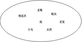 3、先画出下面水田中的食物链,然后在右边写出5条食物链。(8分)